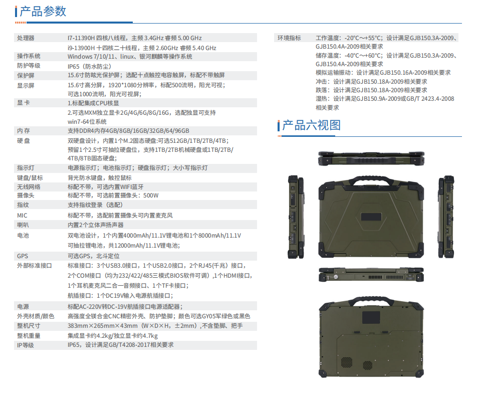 一款搭载Intel 13代处理器的加固笔记本,采用高性能、低功耗、宽温笔记本主板,大容量宽温电池续航时间长;高清、高亮显 屏,防眩光保护盖板;丰富的主板原生扩展 信号PCIE/USB3.0等接口,具有强大的扩展功能、扩展空间,能为不同需求提供定制服务示 。